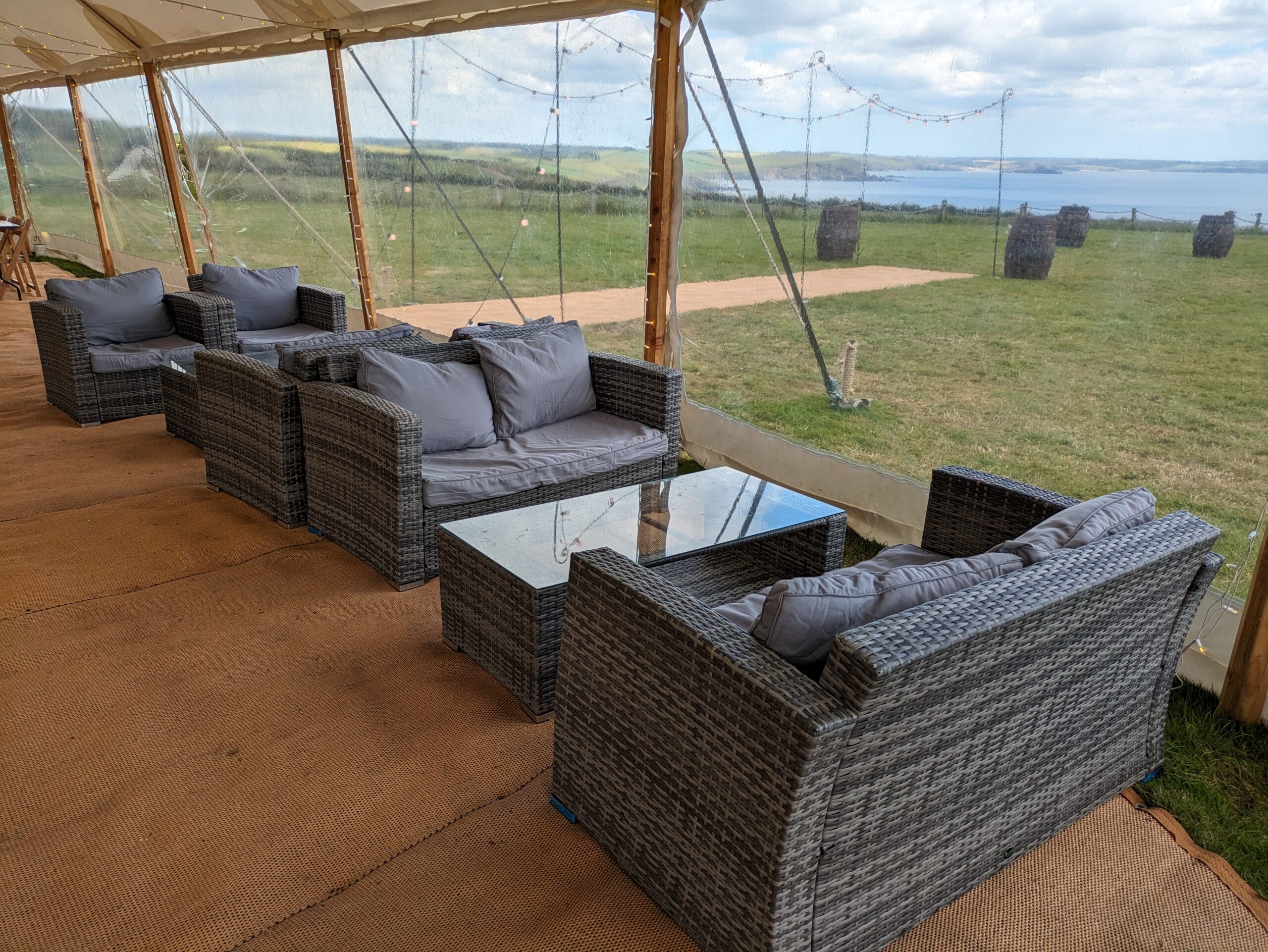 The Capri Marquee system with its stunning curves and the Celeste Pole Marquee, a sail cloth, rustic style marquee. Of course, we also hire all the extras you need to kit out your marquee, from matting and lighting, to tables and chairs.